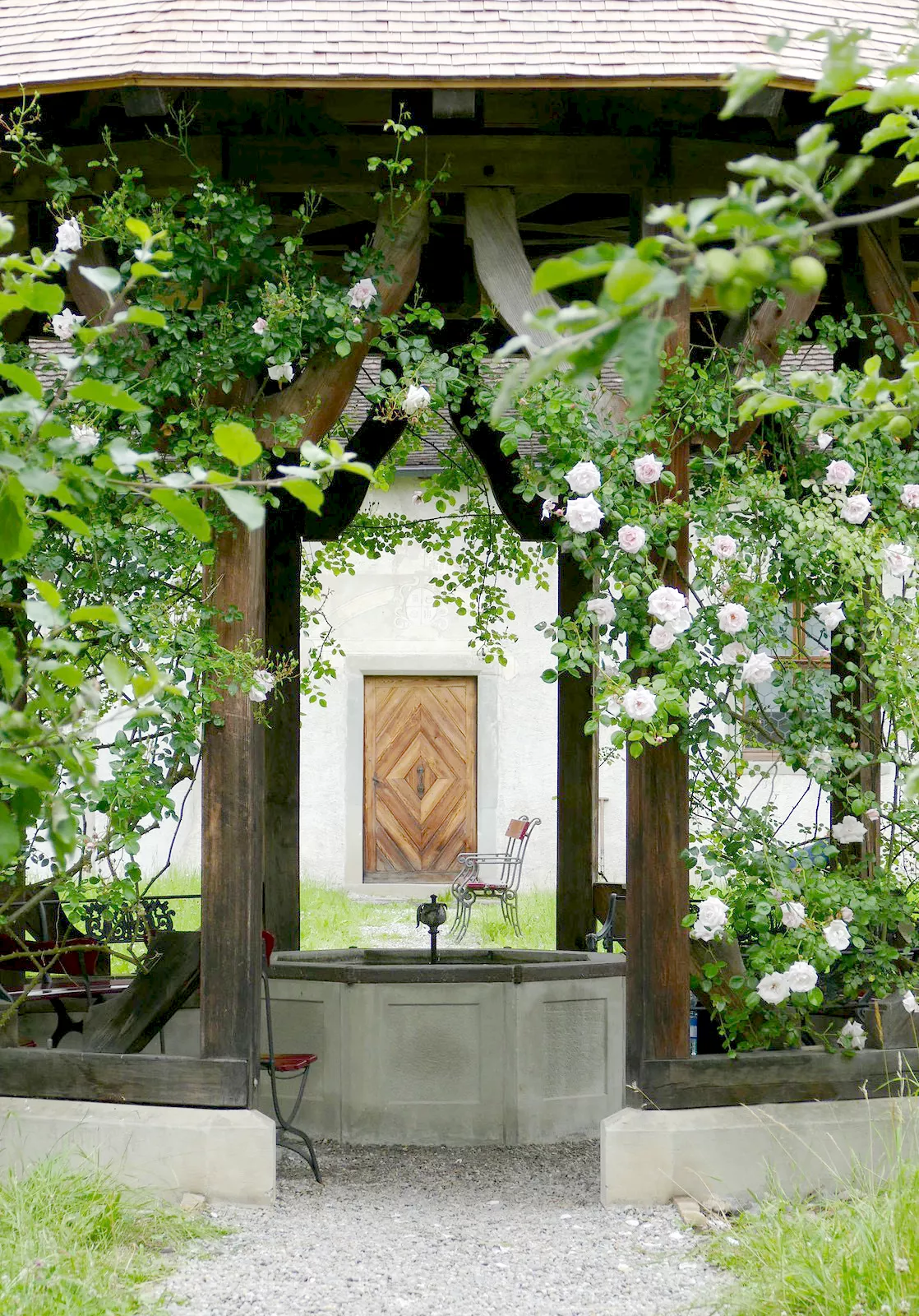 Der heutige Pavillon wurde 1983 nach einer historischen Fotografie des ursprünglichen Pavillons aus dem 18. Jhdt. rekonstruiert und von Elisabeth Oberle und Mitgliedern der rosenfreunde winterthur mit üppigen New Dawn bepflanzt. Bis heute erfreut uns ihre Blütenpracht jeden Sommer neu.